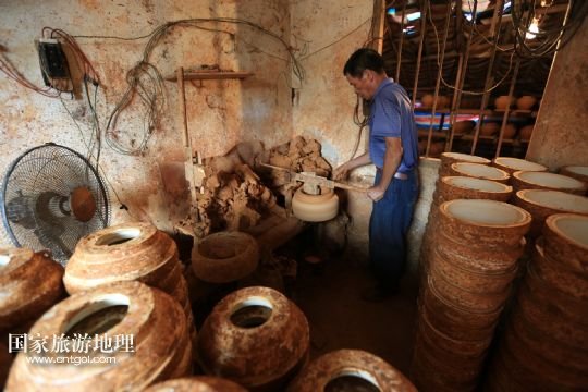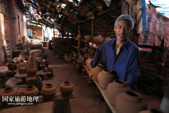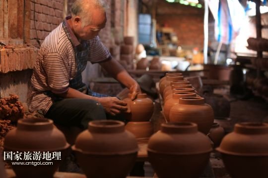 國(guó)家旅游地理 廣西河池8月6日訊 8月4日,顏福友師傅在廣西宜州市郊區(qū)他的制陶作坊里給陶器上釉。在廣西宜州市郊區(qū),65歲的顏福友師傅經(jīng)營(yíng)著他的傳統(tǒng)制陶作坊,作坊里除了顏師傅,還有他的老伴和兩名幫工。顏師傅14歲開(kāi)始當(dāng)學(xué)徒制作陶器,如今掌握著許多手工制陶的獨(dú)門絕技,在作坊里,幫工只負(fù)責(zé)干體力活,制陶的關(guān)鍵部分都是顏師傅親手完成的。由于顏師傅制作出的陶器質(zhì)量好,許多花卉盆景、釀酒、食品等工廠單位向他訂做陶器產(chǎn)品。但是由于手工制陶辛苦單調(diào),效率低下利潤(rùn)不高,顏師傅的手藝面臨著斷代失傳的危險(xiǎn)。 /新華社發(fā)(覃剛 攝)