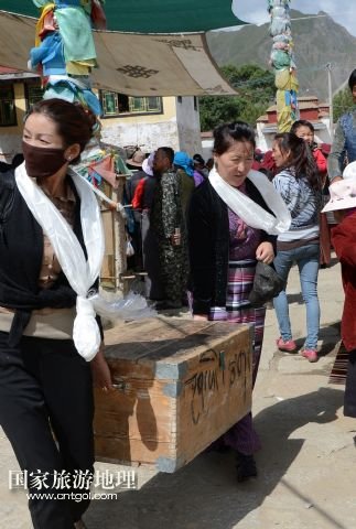 國家旅游地理 西藏拉薩8月9日訊 8月6日,在西藏堆龍德慶縣乃瓊鎮(zhèn)甲熱村,覺木隆藏戲團(tuán)團(tuán)長瓊達(dá)(前右)在演出后和團(tuán)員一起搬運道具。藏戲是藏族人民喜聞樂見的藝術(shù)形式,而發(fā)源于甲熱村(舊稱覺木?。┑挠X木隆藏戲在藏戲各流派中流傳最廣。