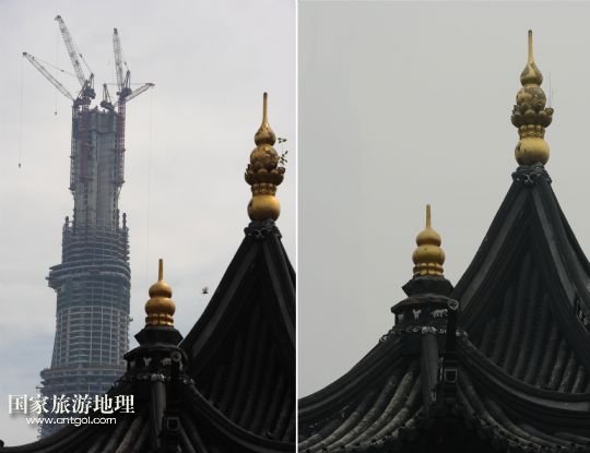 國家旅游地理 上海12月26日訊 這張拼版照片顯示的是:2013年8月3日在上海豫園拍攝的在建中的上海中心(左圖);12月26日在同一地點(diǎn)拍攝的上海中心“消失”在霧霾中(右圖)。當(dāng)日,上海遭遇霧霾天氣,空氣重度污染。 /新華社發(fā)(賴鑫琳 攝)