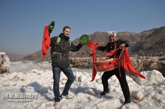 國家旅游地理 陜西延安1月26日訊 1月25日,一名游客在黃河壺口瀑布景區(qū)與民俗演員合影留念。當日,受凌汛影響一度關(guān)閉的黃河壺口瀑布景區(qū)重新開放迎賓,游客可近距離欣賞“冰瀑玉壺”的壯麗景觀。 /新華社發(fā)(呂桂明 攝)
