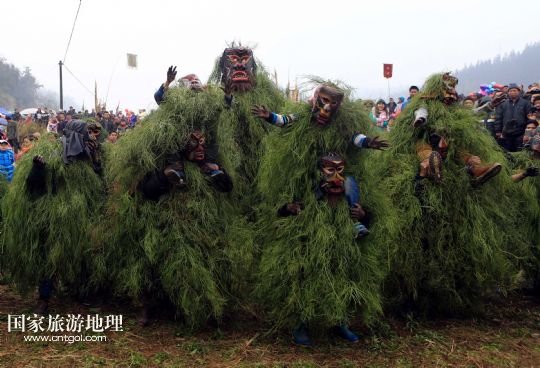 國(guó)家旅游地理 廣西柳州2月20日訊 2月16日,一名苗族青年戴著面具、披著芒草,扮成 “芒哥”跳舞。當(dāng)日是農(nóng)歷正月十七,地處深山的廣西柳州市融水苗族自治縣安陲鄉(xiāng)在江門(mén)苗寨舉行傳統(tǒng)的“芒哥節(jié)”。眾多苗族男性青少年戴著面具、披著芒草、扮成“芒哥”起舞,為人們驅(qū)邪避禍,送去新春的祝福。據(jù)介紹,演“芒哥”是當(dāng)?shù)孛缂胰霜?dú)具特色的新春傳統(tǒng)活動(dòng)之一。 /新華社發(fā)(龍濤 攝)