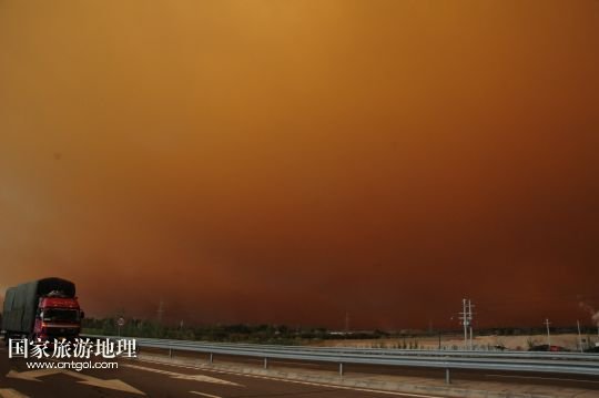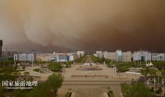 國家旅游地理 甘肅玉門5月23日訊 5月23日,在甘肅玉門市,突如其來的沙塵籠罩了整個城市。當日上午,受新疆低槽冷空氣的影響,甘肅玉門境內天空出現(xiàn)罕見的云層奇景和沙塵天氣,原本非常晴朗的藍天,霎時天昏地暗,同時伴有6至7級西風,能見度只有500米。新華社發(fā)(楊旭升 宋常青 攝)