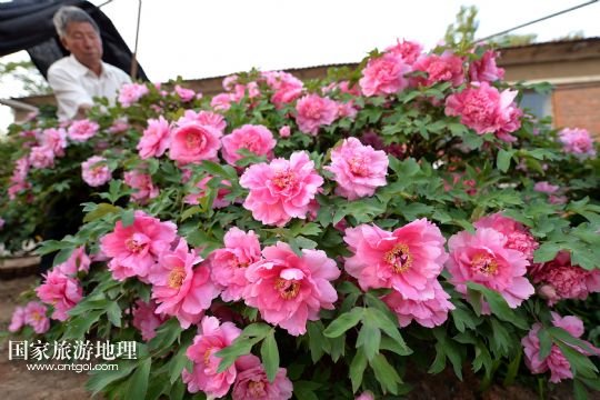 5月22日在內蒙古寧城縣長皋村烏氏家族的庭院里拍攝的盛開的牡丹花。