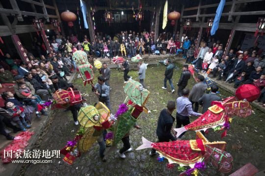 國(guó)家旅游地理 浙江麗水11月10日訊 11月8日,浙江景寧畬族自治縣九龍鄉(xiāng)嶺里村的村民在徐氏宗祠內(nèi)表演傳統(tǒng)非遺節(jié)目——魚(yú)燈。當(dāng)日,浙江省麗水市景寧畬族自治縣“中國(guó)畬鄉(xiāng)魚(yú)燈藝術(shù)村展示非遺之美·慶祝豐年活動(dòng)”在九龍鄉(xiāng)嶺里村舉行。嶺里村自古有在節(jié)日里舞魚(yú)燈的習(xí)俗,寄托著人們期望生活吉祥如意、連年有余的美好愿望。 新華社發(fā)(李肅人 攝)