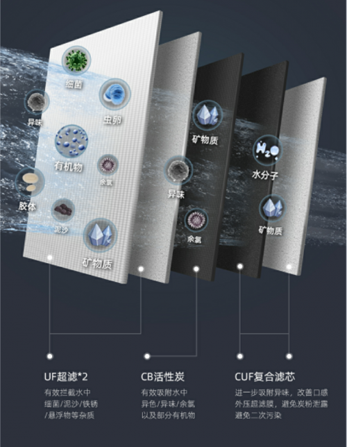 除去主濾芯,另外兩個副濾芯分別是CB活性炭濾芯和CUF活性炭超濾膜復(fù)合濾芯。其中,CB活性炭濾芯吸附水中余氯、異色異味、有機(jī)物,改善飲水口感,讓自來水變得更加甘甜鮮活,口感甚佳;而CUF活性炭超濾膜復(fù)合濾芯則能進(jìn)一步吸附水中的余氯等異色異味,提升飲水口感,并防止碳粉泄露和微生物侵入,避免水質(zhì)二次污染。